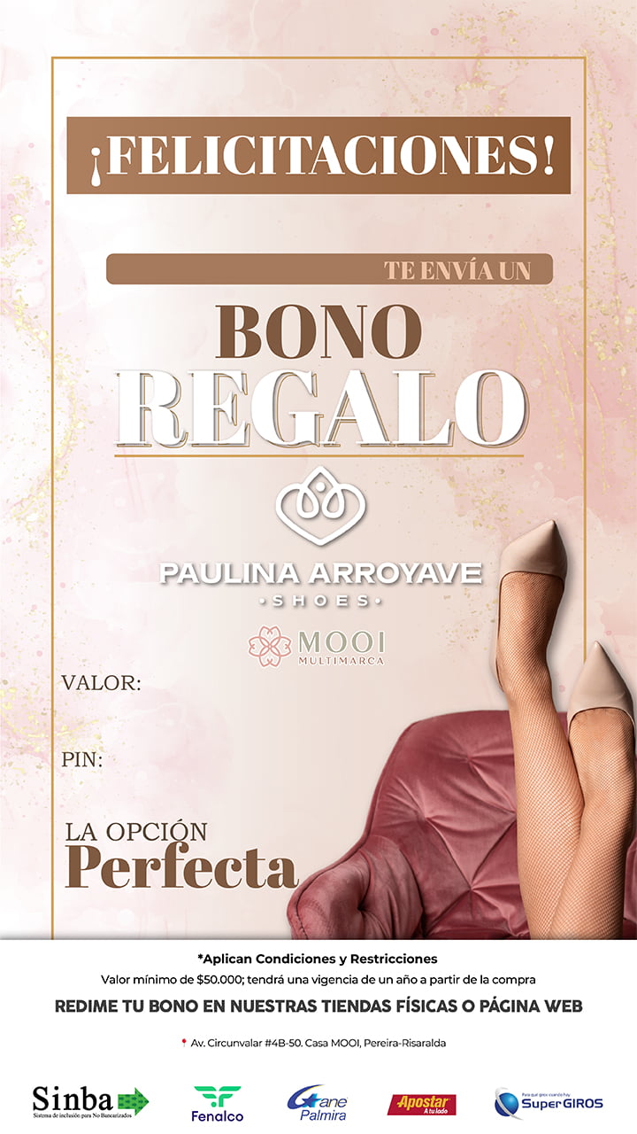 Vigencia de un año a partir de su compra, podrá ser redimido en cualquiera de las Marcas de la Casa MOOI: Piña Colada, Ave Maria, Gracia, Acti Mind, Angela toro, Madeira Exclusive en la dirección Avenida Circunvalar #4B – 50 o en Calle 19 # 5- 73 Local 209, Pereira Risaralda.