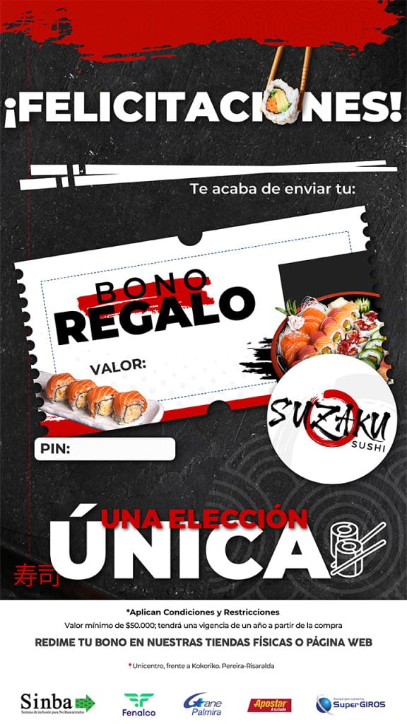 Vigencia de un año a partir de su compra, podrá ser redimido en Unicentro Pereira en la plazoleta de Comidas 1er piso.